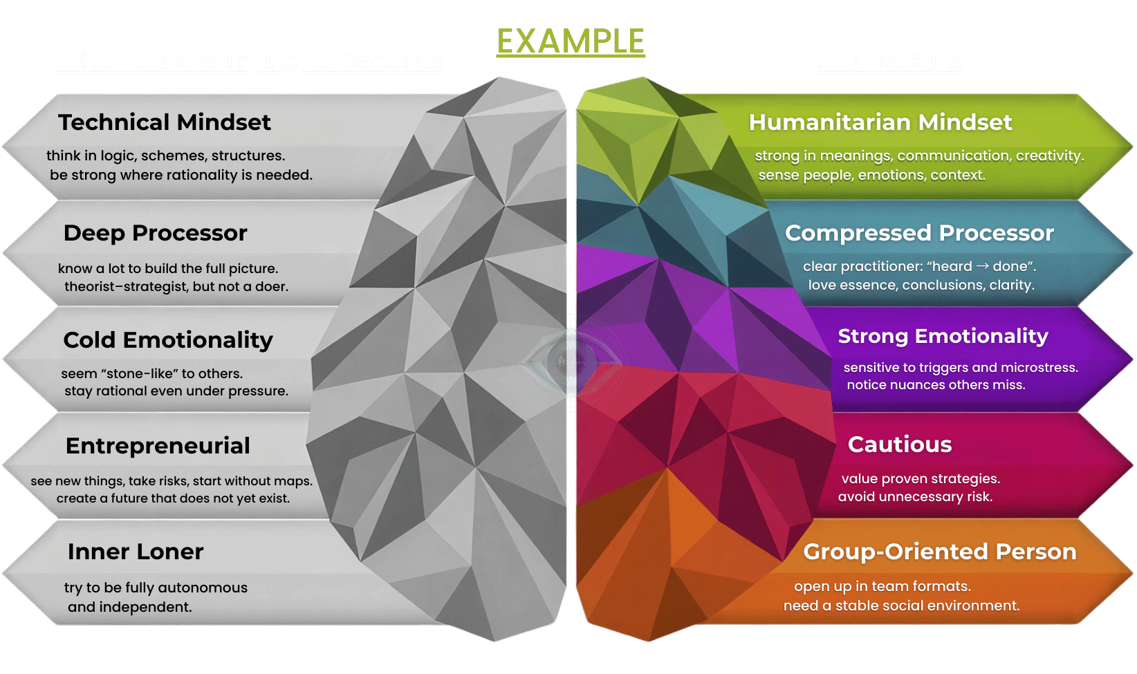 The resulting profile helps you daily: it explains your reactions, improves communication, simplifies task selection, and reduces stress, allowing you to act in alignment with your nature.
