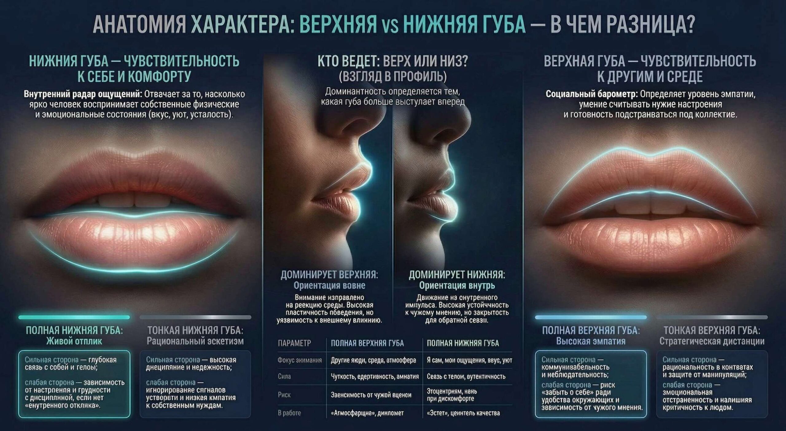 Пример: Бизнесмен с раздельной губой фокусируется исключительно на цели, не отвлекается на эмоции. Со слитной губой может «раствориться» в чужих эмоциях, нуждается в переключении каждые 20–30 минут для продуктивности.